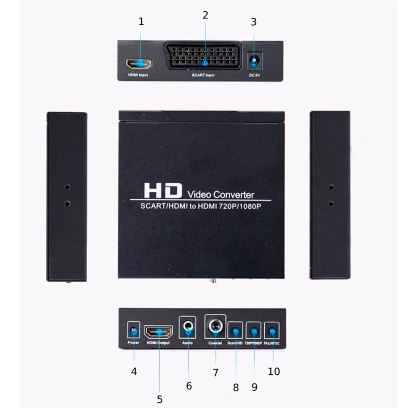 Przedmiotem oferty jest fabrycznie nowy, wysokiej jakości konwerter z funkcją upscaler. Przetwarza analogowy sygnał obrazu i dźwięku SCART na wysokiej rozdzielczości sygnał HDMI. Takie urządzenia pozwalają na podłączenie starszych konsol i odtwarzaczy multimedialnych np. PS1, PS2, magnetowid do monitorów i telewizorów z wejściem HDMI. Adapter ma również wbudowane wejście HDMI, dzięki któremu może pełnić funkcję jako switch.