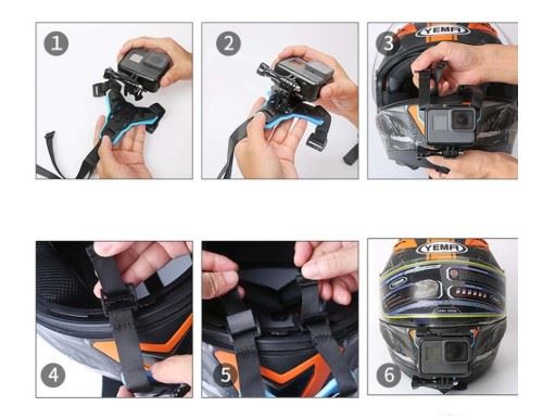Uchwyt pasuje do większości kasków motocyklowych, łącznie z wyczynowymi MX oraz rowerowym kaskami Downhill. Trwałe, stalowe gniazdo gwintu oraz wytrzymałe regulowane paski zapewnią bezpieczeństwo Twojej kamerce.