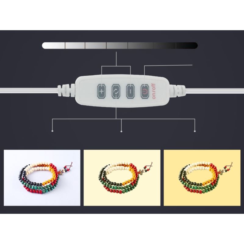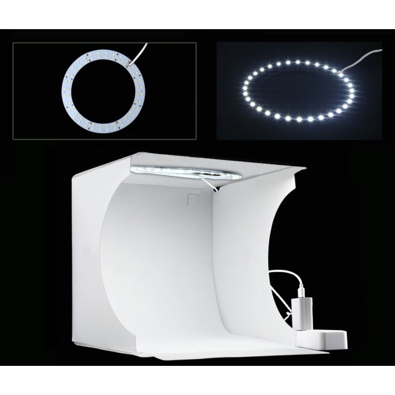 Wbudowane panele LED zapewniają idealne doświetlenie namiotu. Lampy posiadają także możliwość zmiany pozycji, dzięki czemu możemy samodzielnie dostosować kierunek światła. Wbudowane oświetlenie ledowe zapobiega cieniom i odbiciom na zdjęciach. Jest zasilanie przez kabel micro usb.