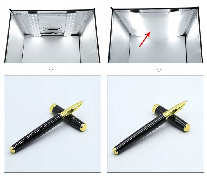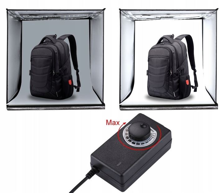 Dwie listwy o łącznej mocy 60W mocowane są wewnątrz konstrukcji i zapewniają światło o barwie 5500K. W połączeniu ze srebrnym, odblaskowym wnętrzem namiotu oraz sterownikiem odpowiedzialnym za regulację natężenia światła, stwarzają idealne warunki do fotografowania.