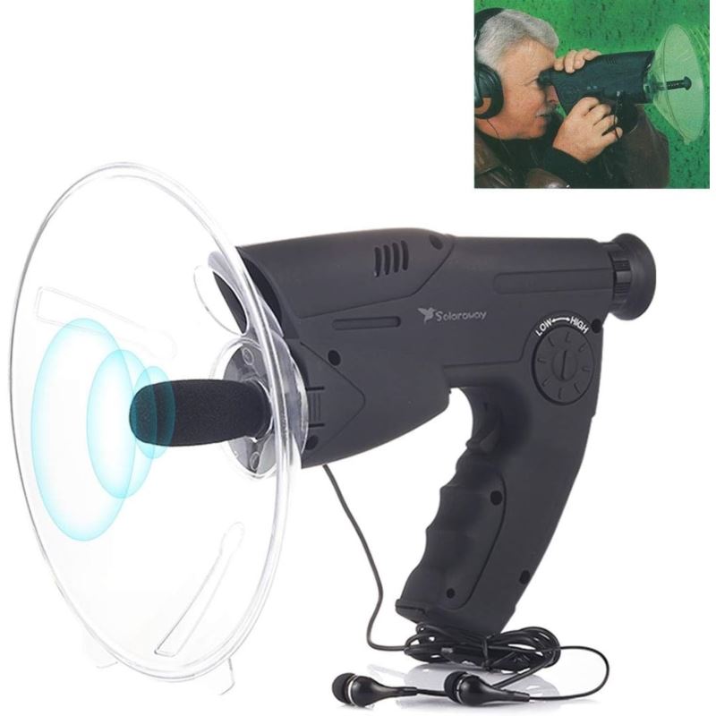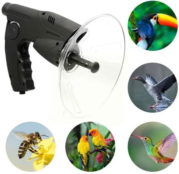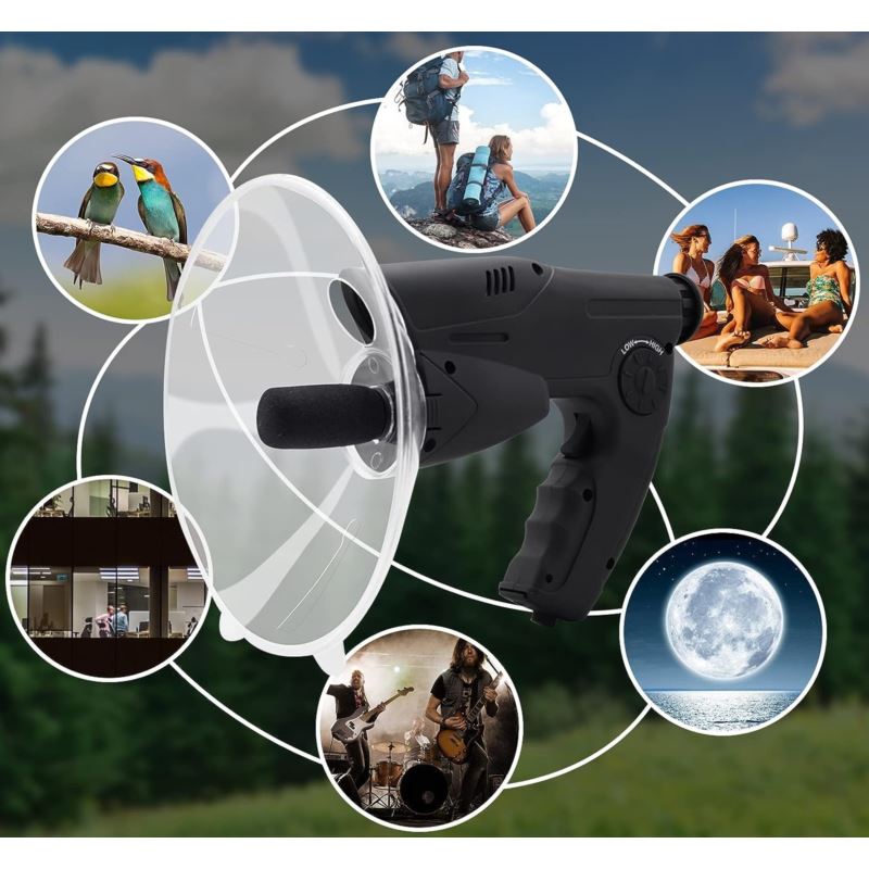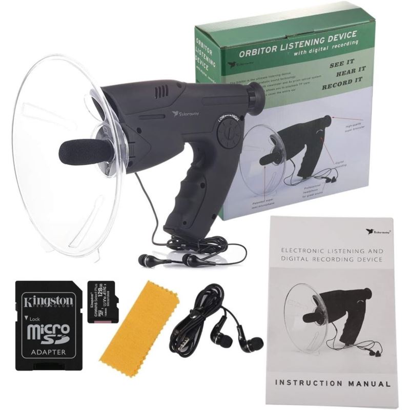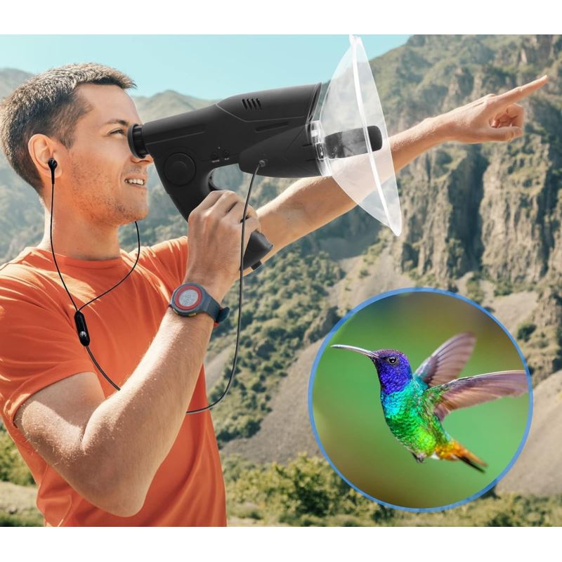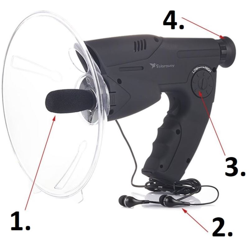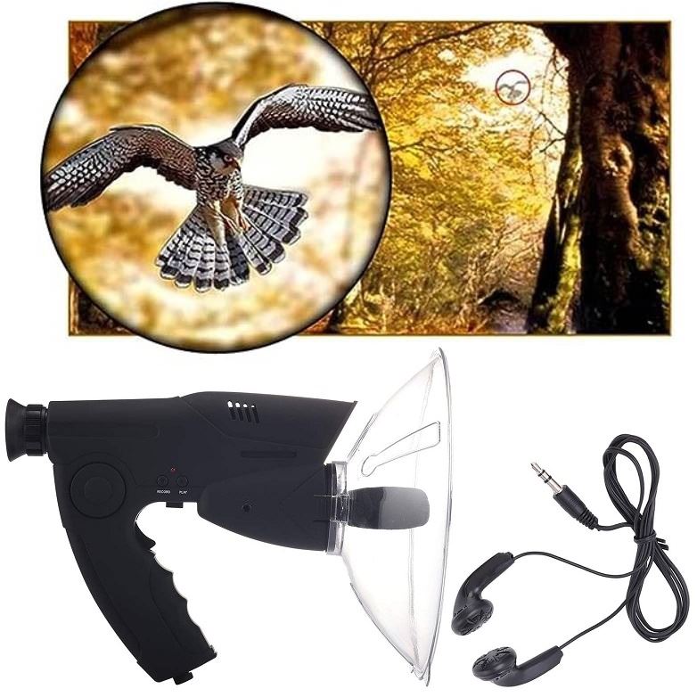 Paraboliczna antena skupiająca dźwięk pozwala na świetny odbiór dźwięków, a zintegrowany obiektyw z przybliżeniem x8 pozwala na obserwacje np. nasłuchiwanego ptaka lub podsłuchiwanej osoby.