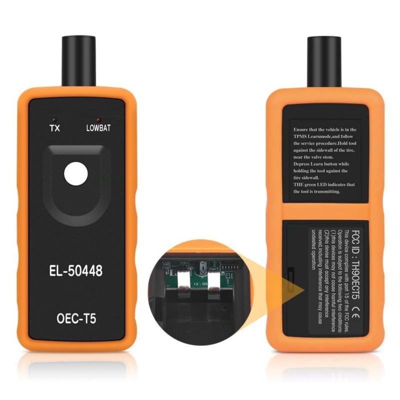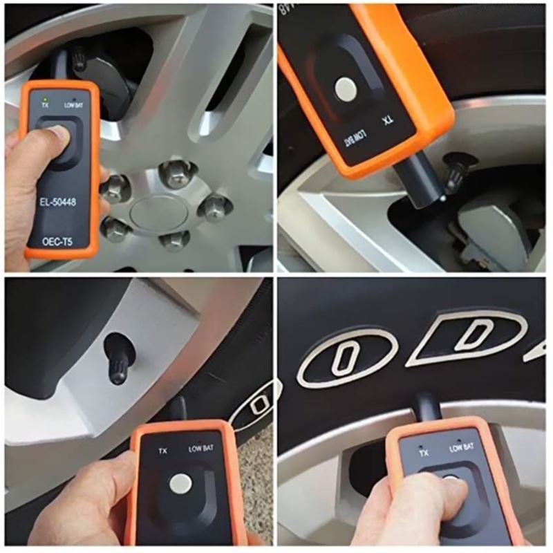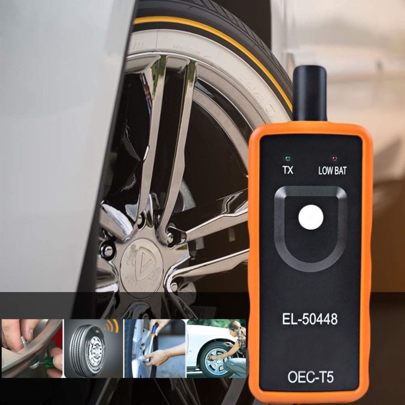 EL-50448 OEC-T5 może pomóc w łatwym przeprogramowaniu ciśnienia w oponach w zaledwie 3 krokach. To narzędzie do resetowania modułu TPM umożliwia łatwe aktywowanie pojedynczego czujnika TPM za pomocą tylko jednego przycisku. Przed użyciem narzędzia upewnij się, że Twój samochód jest w trybie uczenia TPMS. Przyłóż narzędzie do ściany bocznej opony, w pobliżu rdzenia zaworu. Naciśnij przycisk uczenia, trzymając narzędzie przy boku opony, aż usłyszysz dźwięk klaksonu z samochodu.