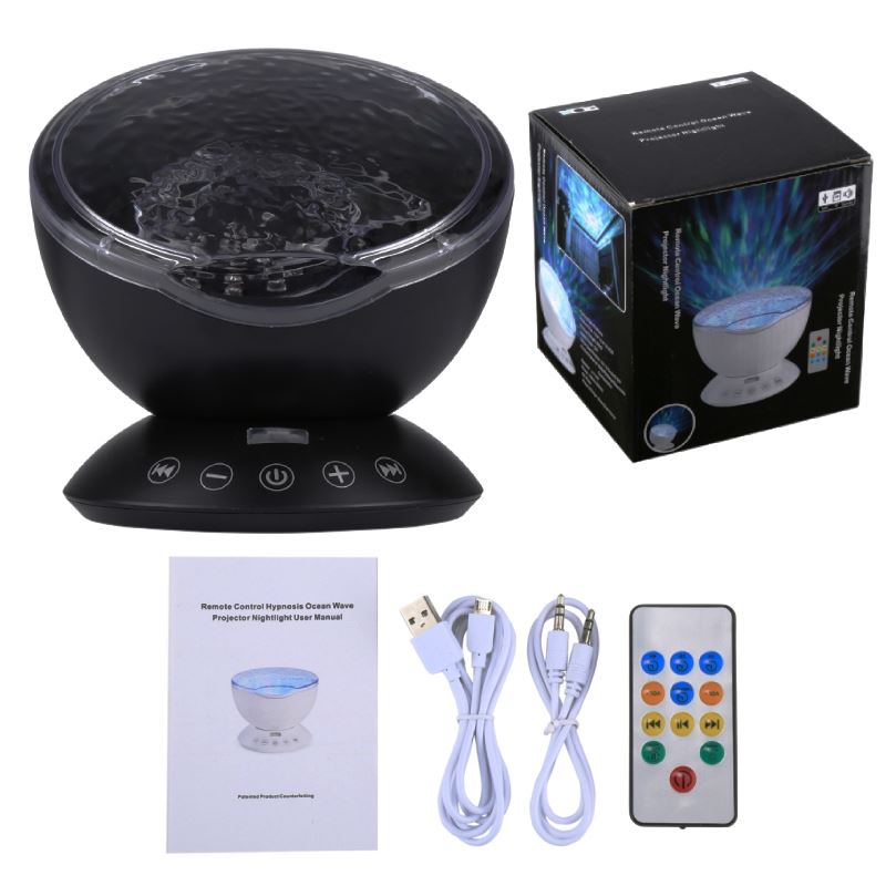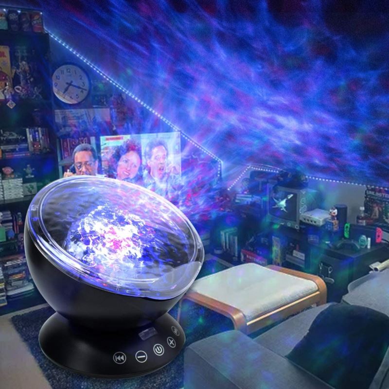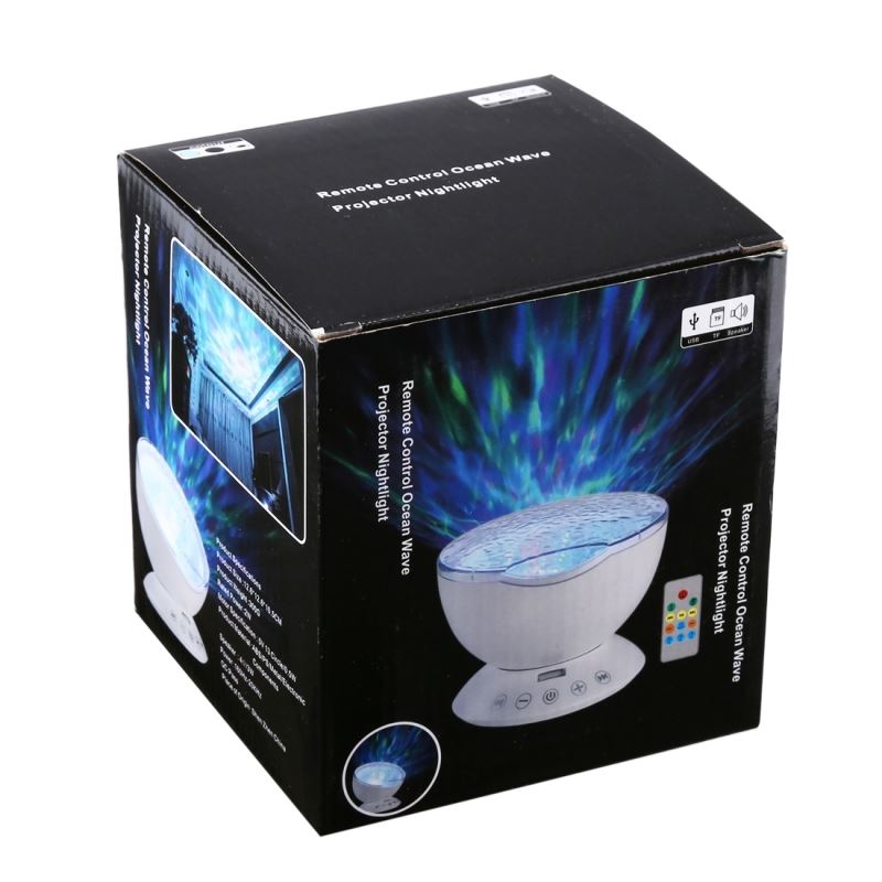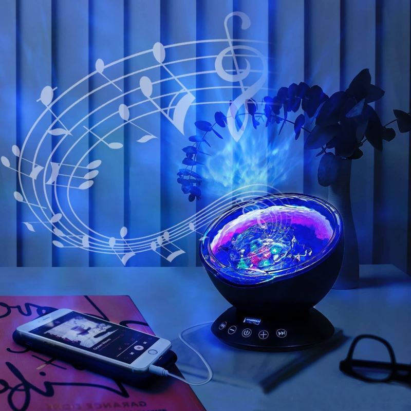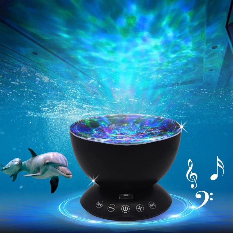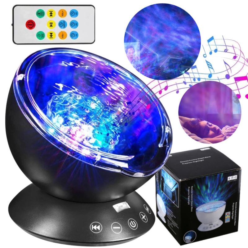 Przedmiotem oferty jest projektor, lampka LED z wbudowanym głośnikiem. Jest to oryginalny gadżet pasujący do każdego wnętrza. Sprawdzi się idealnie jako lampka nocna rzucająca na sufit efekt morskich fal.