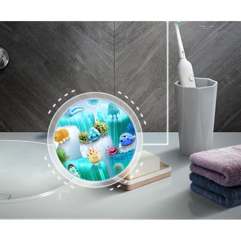 Według badań nawet po wypłukaniu szczoteczki dalej na jej główce pozostają mikroorganizmy i innego rodzaju zanieczyszczenia, które mogą mieć wpływ na twoje zdrowie. Dlatego też po każdorazowym umyciu zębów zaleca się zdezynfekowanie szczoteczki. W łatwy sposób można tego dokonać. Wystarczy przełączyć boczny przycisk i lampy UV w dozowniku natychmiatowo niszczą bakterie i zanieczyszczenia!