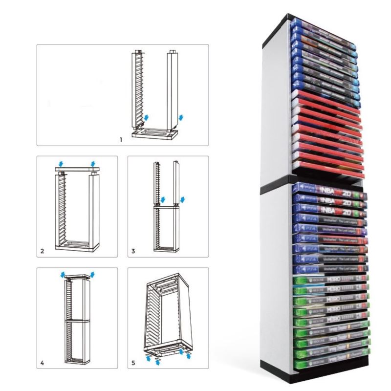 Podstawka jest w stanie pomieścić, aż 36 pudełek gier z możliwością powiększenia zestawu o kolejne partie, dzięki prostej i łatwej konstrukcji. Montaż przebiega łatwo bez konieczności wiercenia czy przybijania gwoździ. Bez problemu złożysz go sam!