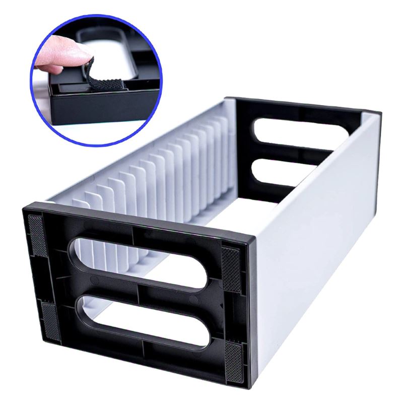 W zestawie dodatkowo znajdują się gumowe antypoślizgowe nóżki zapobiegające przesuwaniu się stojaka, dzięki czemu Twoje gry pozostają bezpiecznie ulokowane na półkach.
