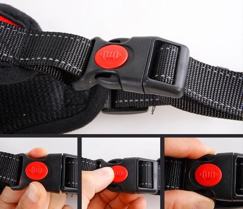 Zatrzaski wykonane zostały z wytrzymałego tworzywa. Dodatkowo każdy zatrzask ma specjalną blokadę (na zdjęciu w kolorze czerwonym) zapobiegającą przed przypadkowym rozpięciem się pasów i ucieczką psiaka.
